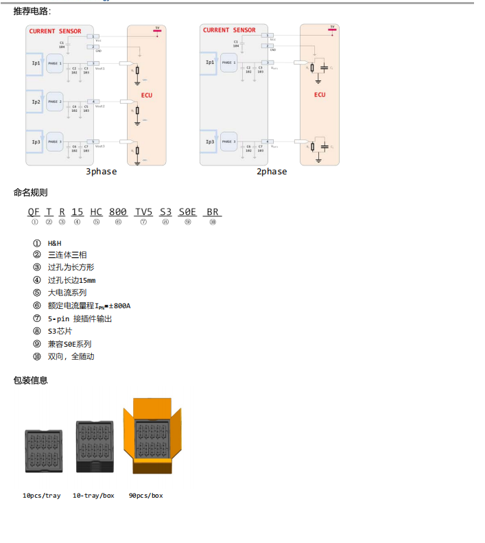 QFTR15HC800TV5S3S0E-BR、QFDR15HC800TV5S3S0E-BR系列电流传感器是为汽车应用领域低电压,大电流设计的三合一产品,为AC,DC, 或脉冲电流检测提供了速度更快,性价比更高的解决方案,并为原边和副边提供了有效隔离。