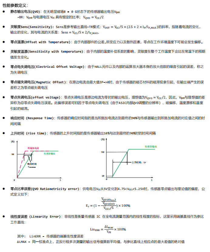 开环电流传感器利用安培定律(一根通电直导线周边产生的磁场与导线中的电流成比例),利用 hall 器件的特性,通过检测原边电流产生的磁场强度 B的大小,从而检测出导线中的电流大小。在磁滞的线性区间内,B 与 I 的比例关系为: