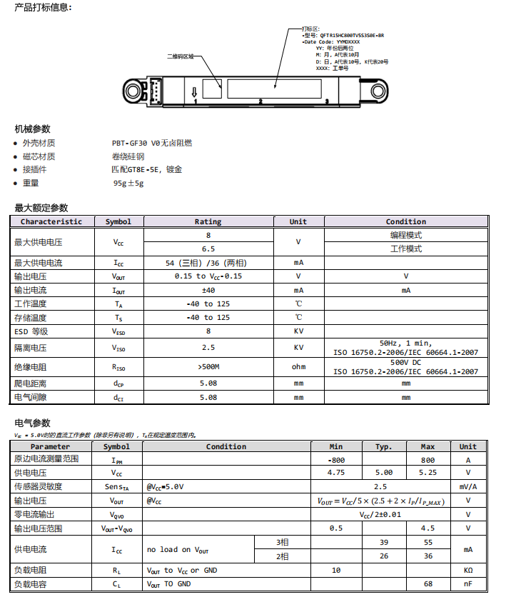 QFTR15HC800TV5S3S0E-BR、QFDR15HC800TV5S3S0E-BR系列电流传感器是为汽车应用领域低电压,大电流设计的三合一产品,为AC,DC, 或脉冲电流检测提供了速度更快,性价比更高的解决方案,并为原边和副边提供了有效隔离。