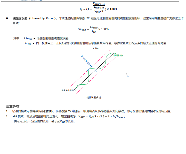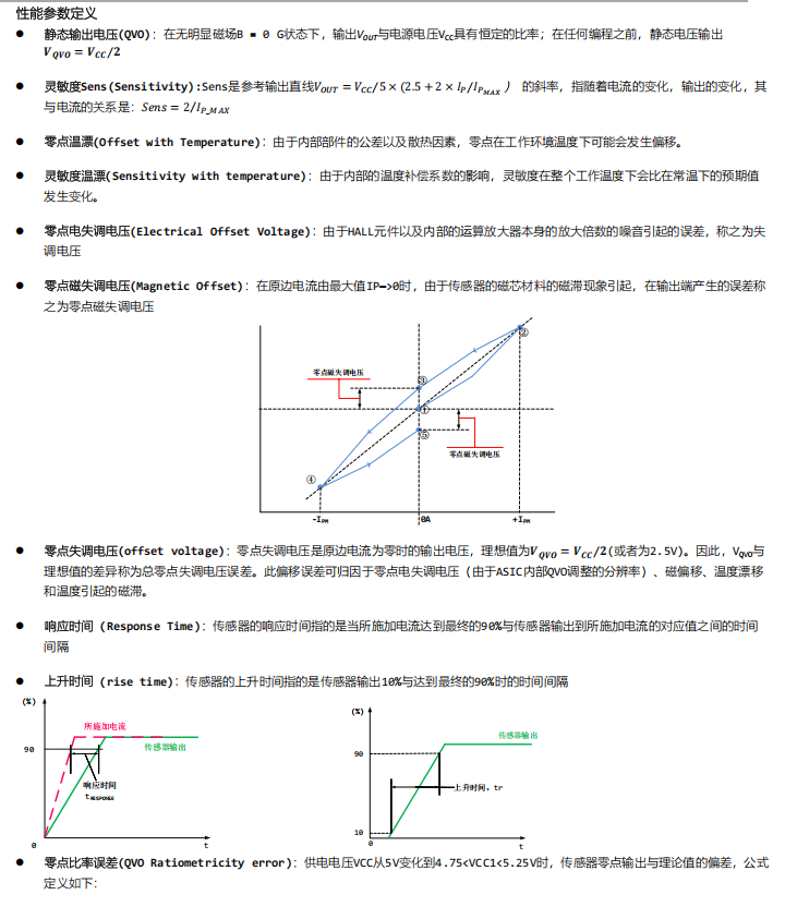 开环电流传感器利用安培定律(一根通电直导线周边产生的磁场与导线中的电流成比例),利用hall器件的特性,通过检测原边电流产生的磁场强度B的大小,从而检测出导线中的电流大小。在磁滞的线性区间内,B与I的比例关系为: