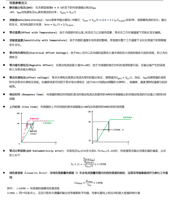 开环电流传感器利用安培定律(一根通电直导线周边产生的磁场与导线中的电流成比例),利用hall器件的特性,通过检测原边电流产生的磁场强度B的大小,从而检测出导线中的电流大小。在磁滞的线性区间内,B与I的比例关系为:B(IP)= K * IP (K为常数)