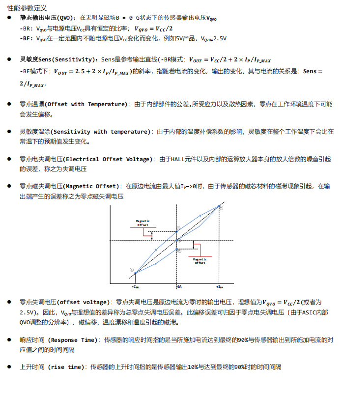 开环电流传感器利用安培定律(一根通电直导线周边产生的磁场与导线中的电流成比例),利用 hall 器件的特性,通过检测原边电流产生的磁场强度 B 的大小,从而检测出导线中的电流大小。在磁滞的线性区间内,B 与 I 的比例关系为: