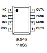 该芯片内置了全桥 MOS 驱动,能够轻松实现马达的正转、反转、停止以及刹车等多种功能,满足不同应用场景下的多样化需求。在安全保护方面,118SS 更是表现出色。它采用了过流保护(迟滞热效应)和过温保护(阈值设定为 150℃)机制。当马达出现堵转或短路等异常情况时,过流保护功能会迅速启动,防止芯片因过流而损坏;而过温保护功能则能在芯片温度过高时自动切断电路,避免因高温引发的安全事故,为设备的稳定运行提供了可靠保障。