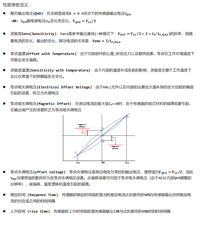 开环电流传感器利用安培定律(一根通电直导线周边产生的磁场与导线中的电流成比例),利用 hall 器件的特性,通过检测原边电流产生的磁场强度 B 的大小,从而检测出导线中的电流大小。在磁滞的线性区间内,B 与 I 的比例关系为: