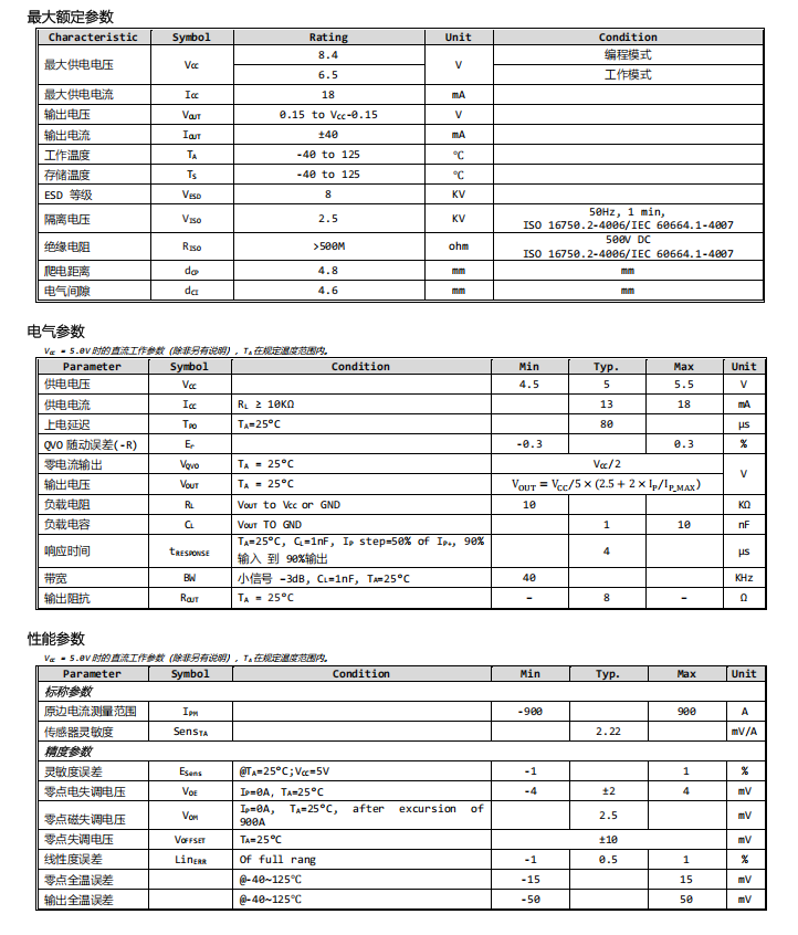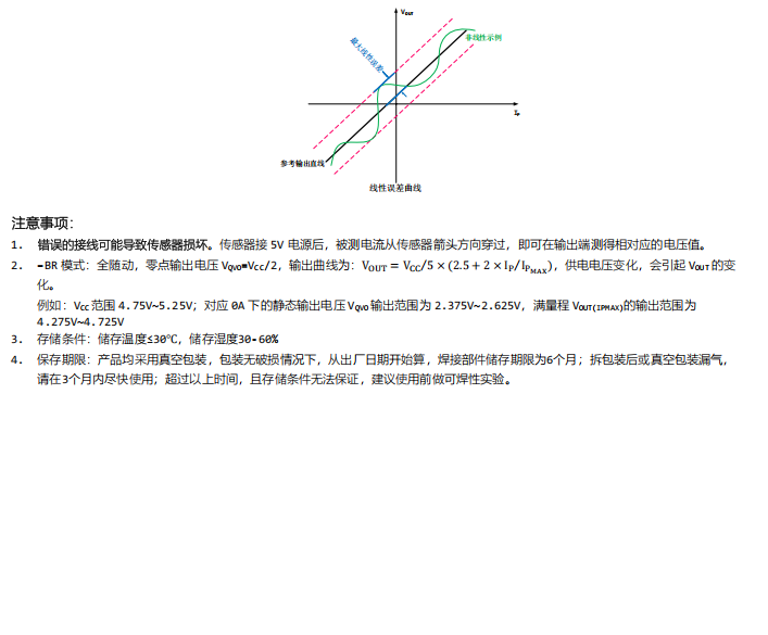 开环电流传感器利用安培定律(一根通电直导线周边产生的磁场与导线中的电流成比例),利用 hall 器件的特性,通过检测原边电流产生的磁场强度 B的大小,从而检测出导线中的电流大小。在磁滞的线性区间内,B 与 I 的比例关系为: